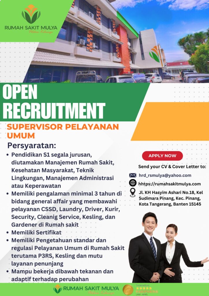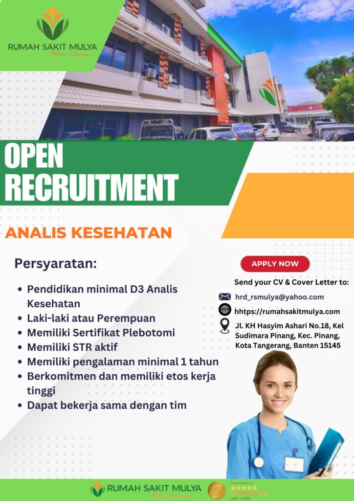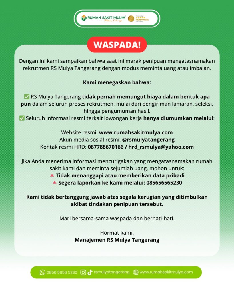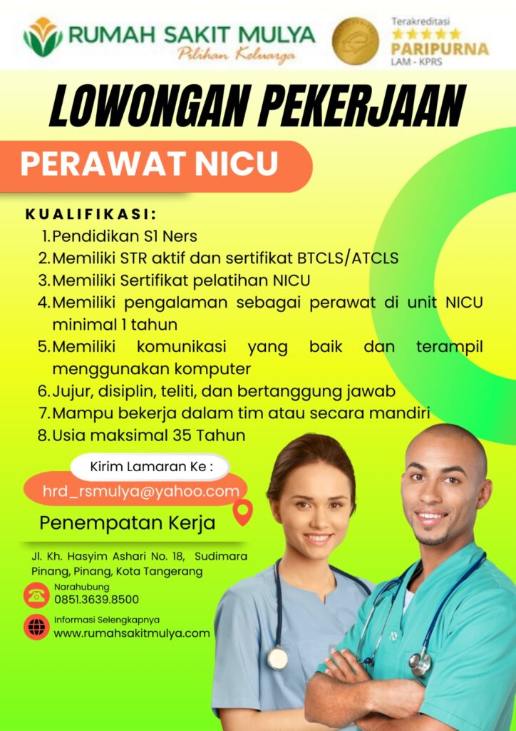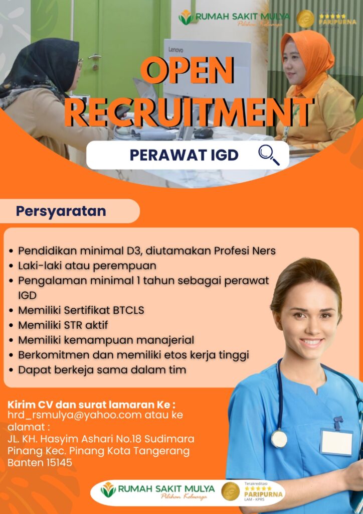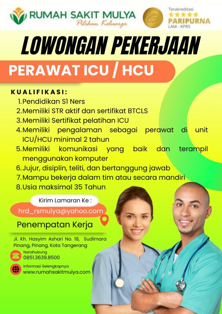 Rumah Sakit Mulya Tangerang membuka kesempatan bagi anda yang ingin berkarir, bila anda memenuhi syarat kirimkan surat lamaran ke alamat email: hrd_rsmulya@yahoo.com atau kirim ke alamat Jl. KH. Hasyim Ashari No. 18 Sudimara Pinang, Kecamatan Pinang, Kota Tangerang – Banten. Lowongan yang tersedia saat ini: