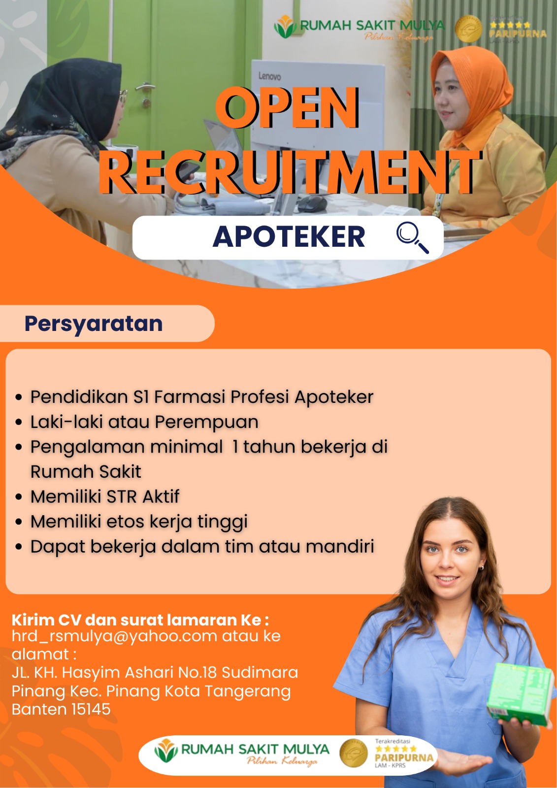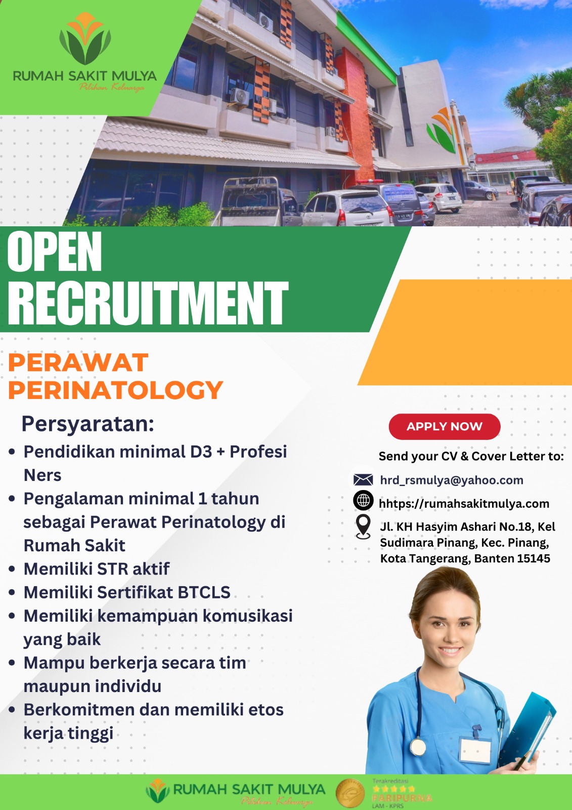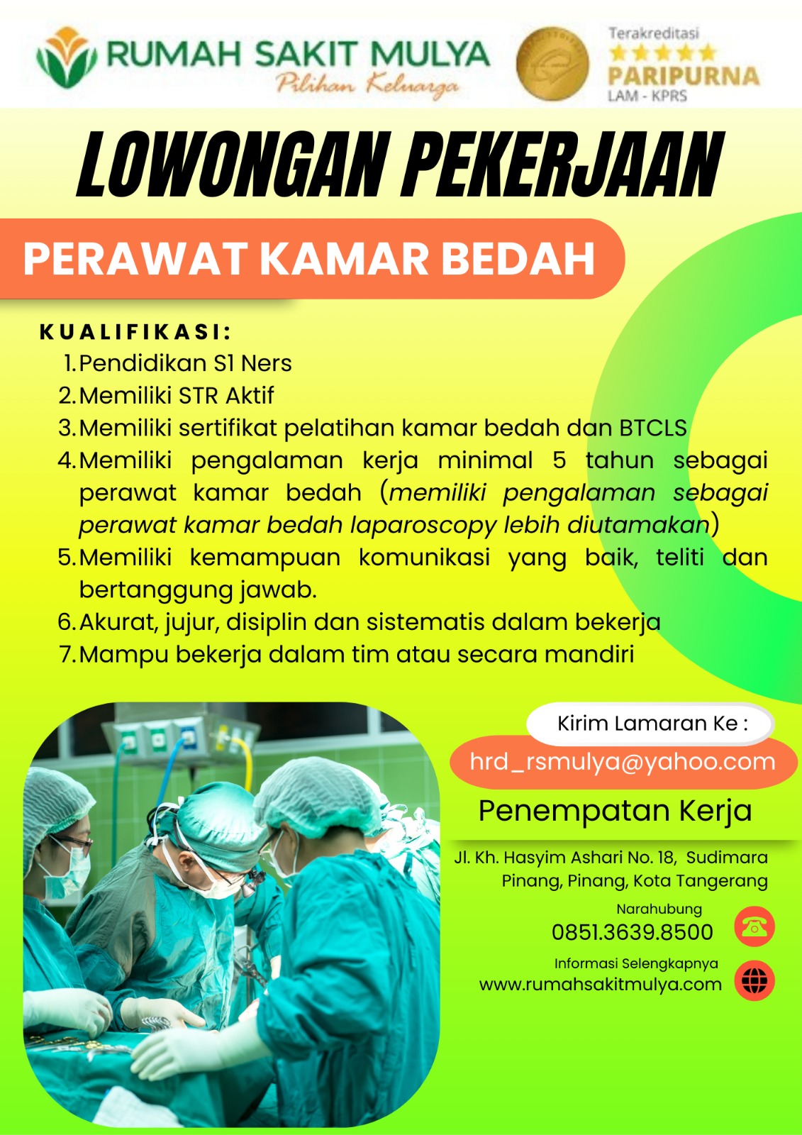 Rumah Sakit Mulya Tangerang membuka kesempatan bagi anda yang ingin berkarir, bila anda memenuhi syarat kirimkan surat lamaran ke alamat email: hrd_rsmulya@yahoo.com atau kirim ke alamat Jl. KH. Hasyim Ashari No. 18 Sudimara Pinang, Kecamatan Pinang, Kota Tangerang – Banten. Lowongan yang tersedia saat ini: