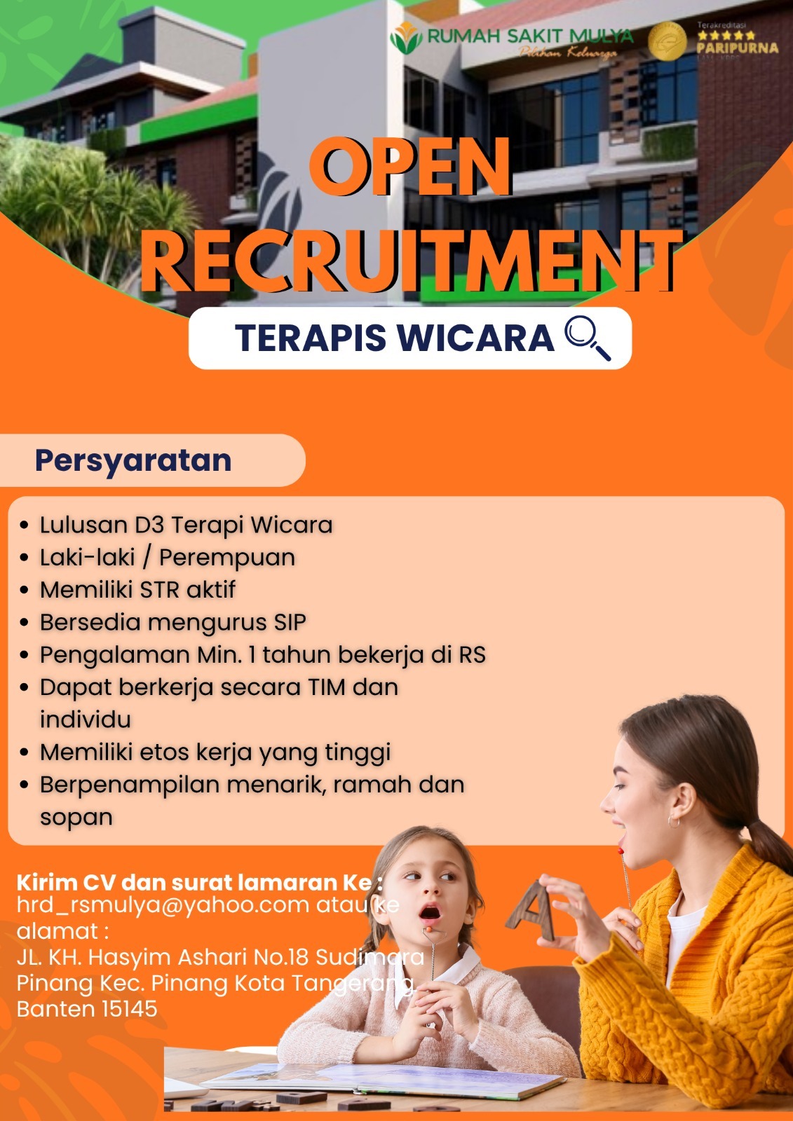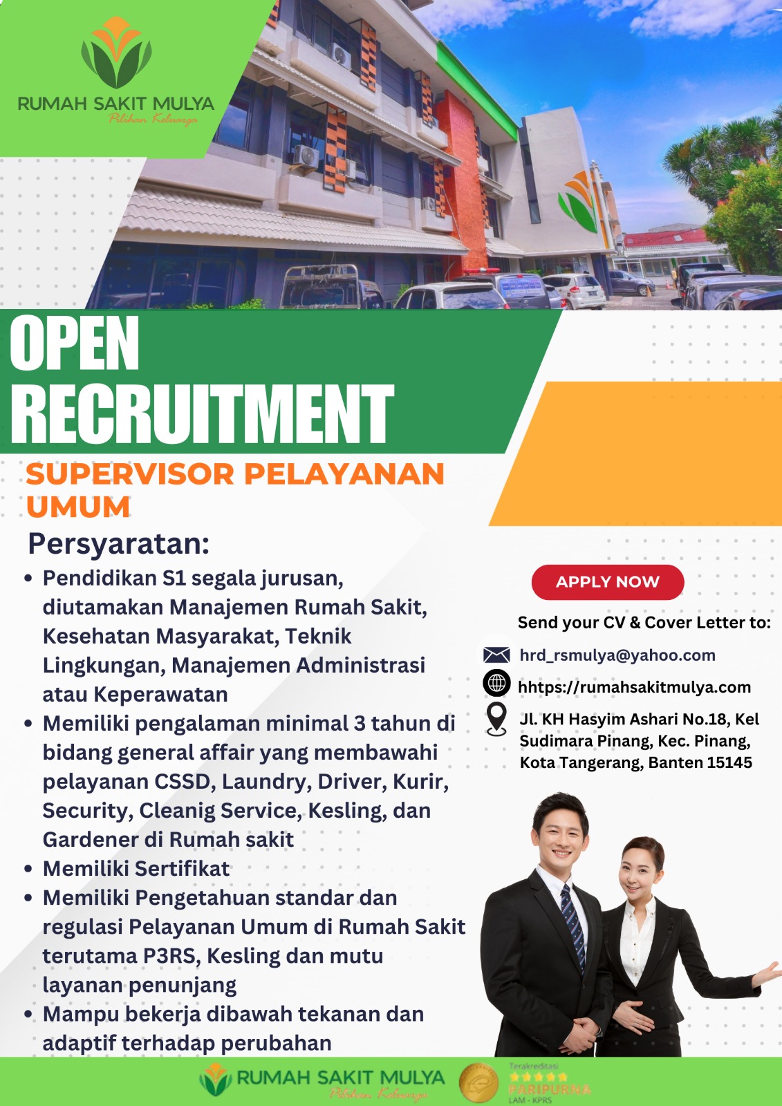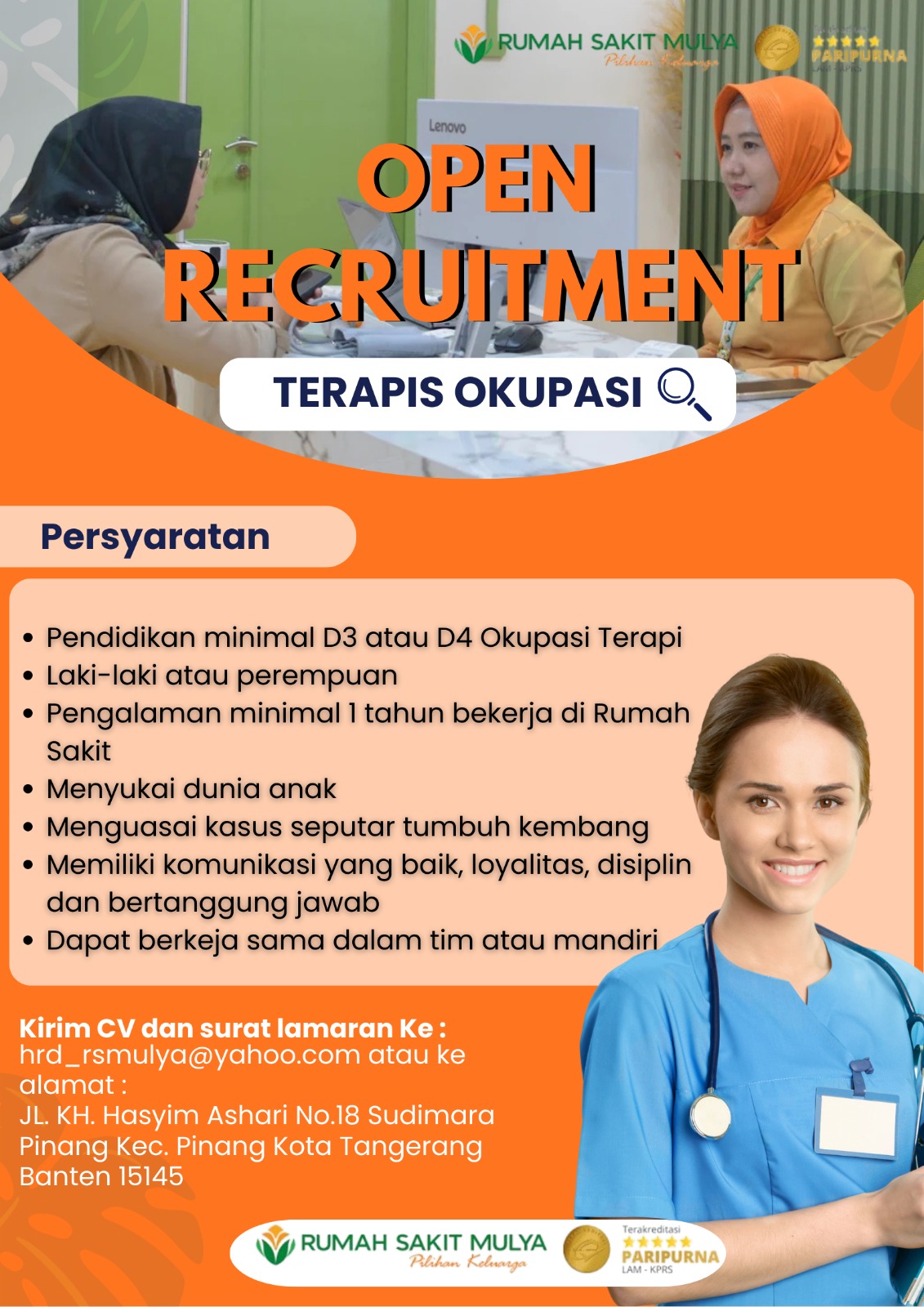 Rumah Sakit Mulya Tangerang membuka kesempatan bagi anda yang ingin berkarir, bila anda memenuhi syarat kirimkan surat lamaran ke alamat email: hrd_rsmulya@yahoo.com atau kirim ke alamat Jl. KH. Hasyim Ashari No. 18 Sudimara Pinang, Kecamatan Pinang, Kota Tangerang – Banten. Lowongan yang tersedia saat ini: