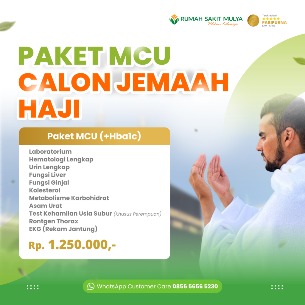 Tentunya di RS Mulya yang berlokasi di tangerang juga menyediakan layanan MCU untuk keperluan haji dan umroh dengan harga yang sangat terjangkau. Untuk para calon jamaah yang hendak melakukan MCU di RS Mulya tangerang, silahkan kunjungi link ini untuk informasi lebih lanjut